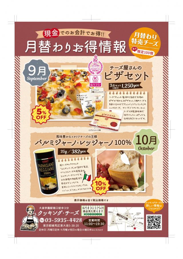 9月 2022年ねりコレ認定記念して、チーズ屋さんのピザセット5%OFF